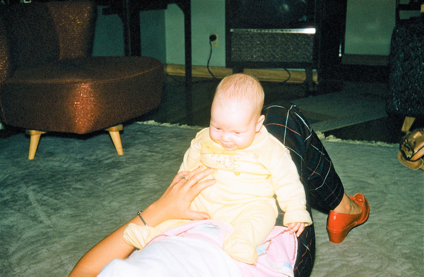I have just one photo of my prized chair. This photo tells the tale of me as a baby, joyfully sitting on my mom’s lap, my red chair patiently waiting for me in the corner.