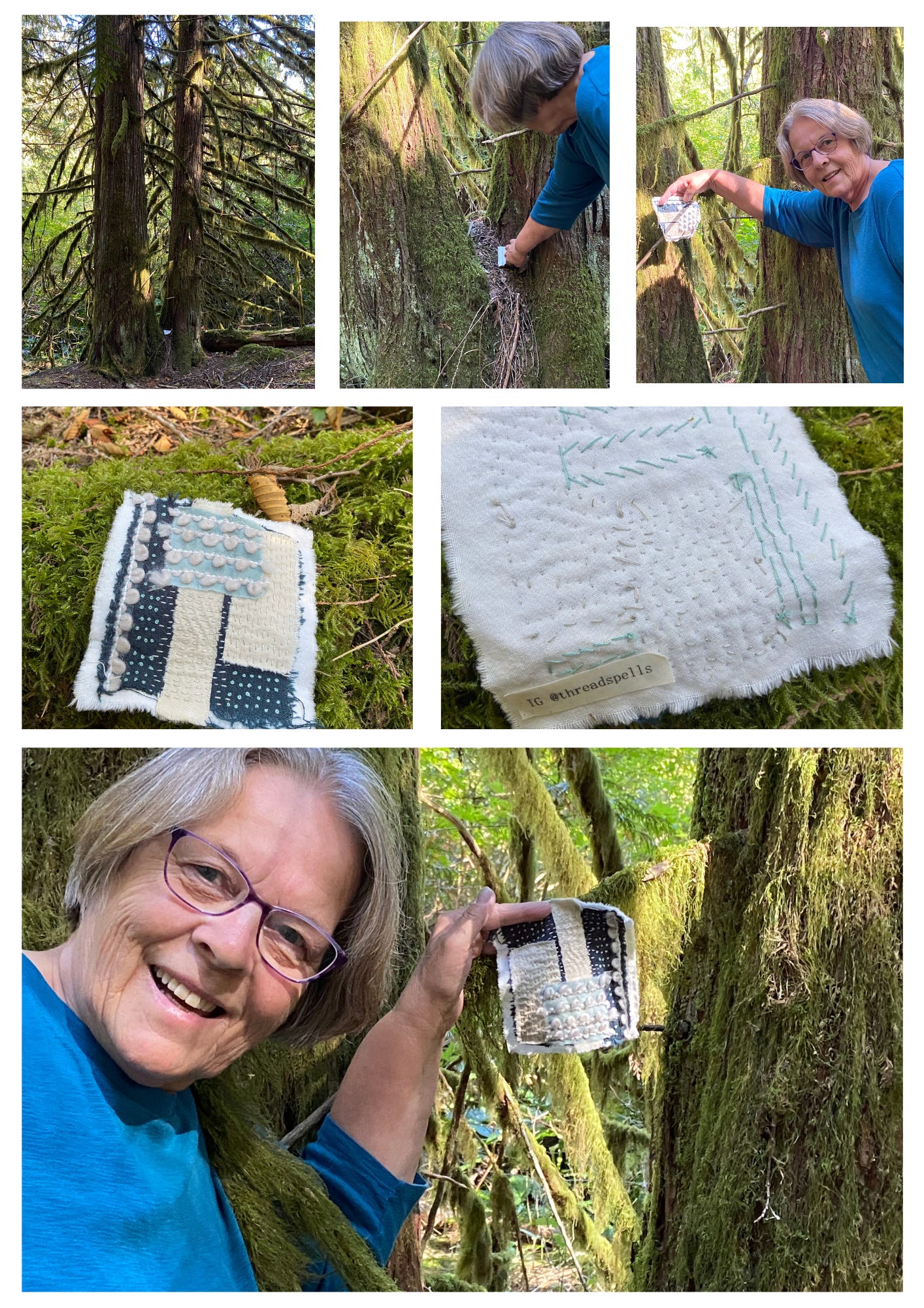 One day my husband and I headed to a beautiful little lake for a hike, not because I love to hike, because I’d heard from a friend that she had released a slow-stitch panel into the wild. I wanted so badly to find it. It was the perfect piece for me - full of texture and just my colors.