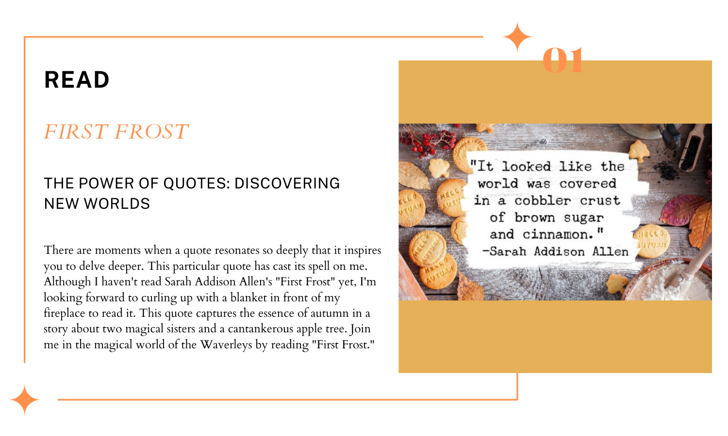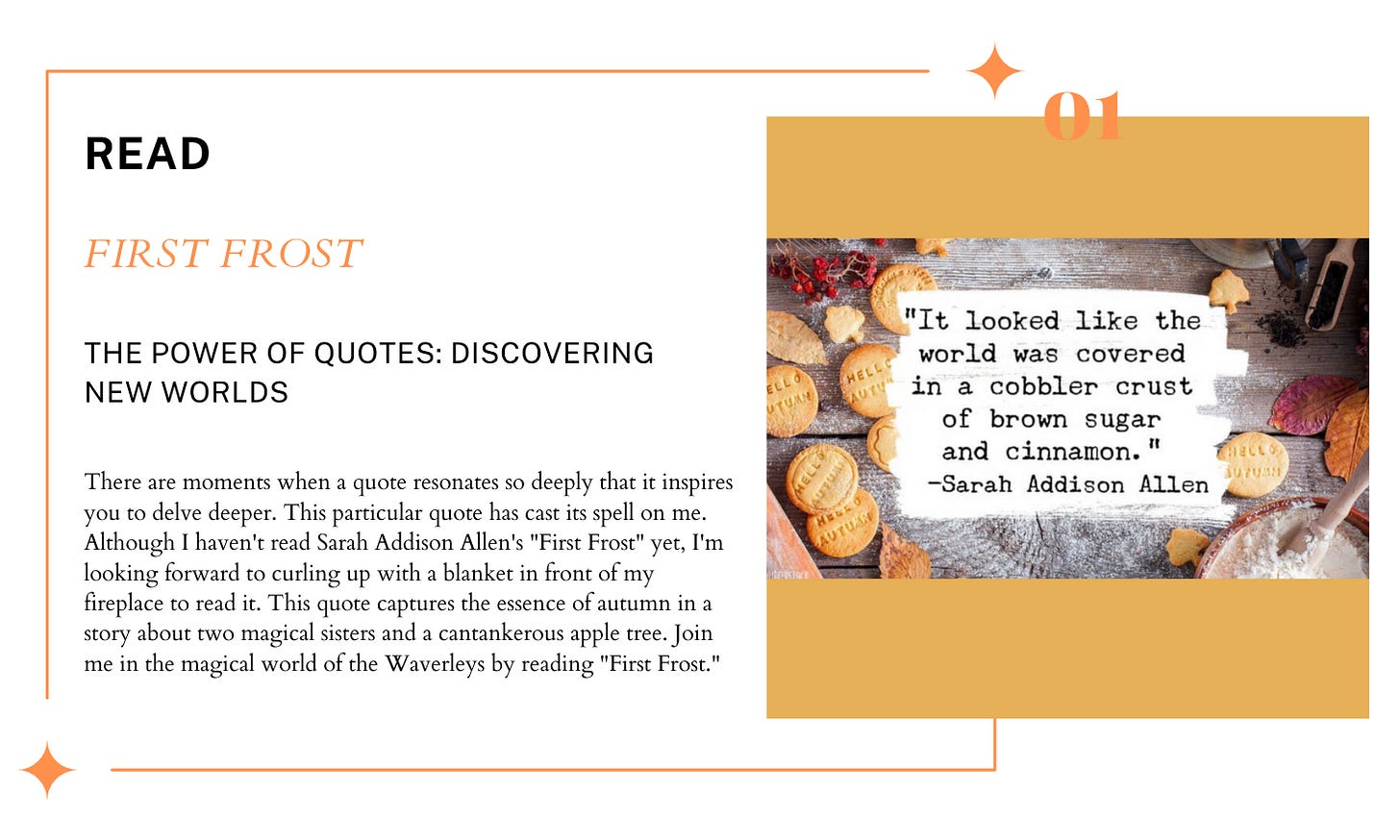 I have "First Frost" sitting on my bookshelf to read next!