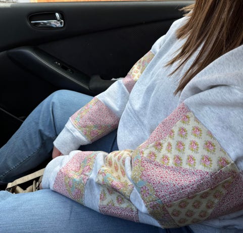 My 15-year-old granddaughter was on her Spring break. She asked if I’d help her quilt the sleeves of her new hoodie. I thought it might just be strips of fabric. No, she wanted triangles and strips. OK, challenge accepted.