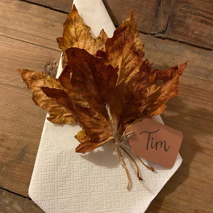 Take a walk and gather a few colorful leaves. Tie the leaves and a name tag with twine and simply set on a folded napkin at each place setting.