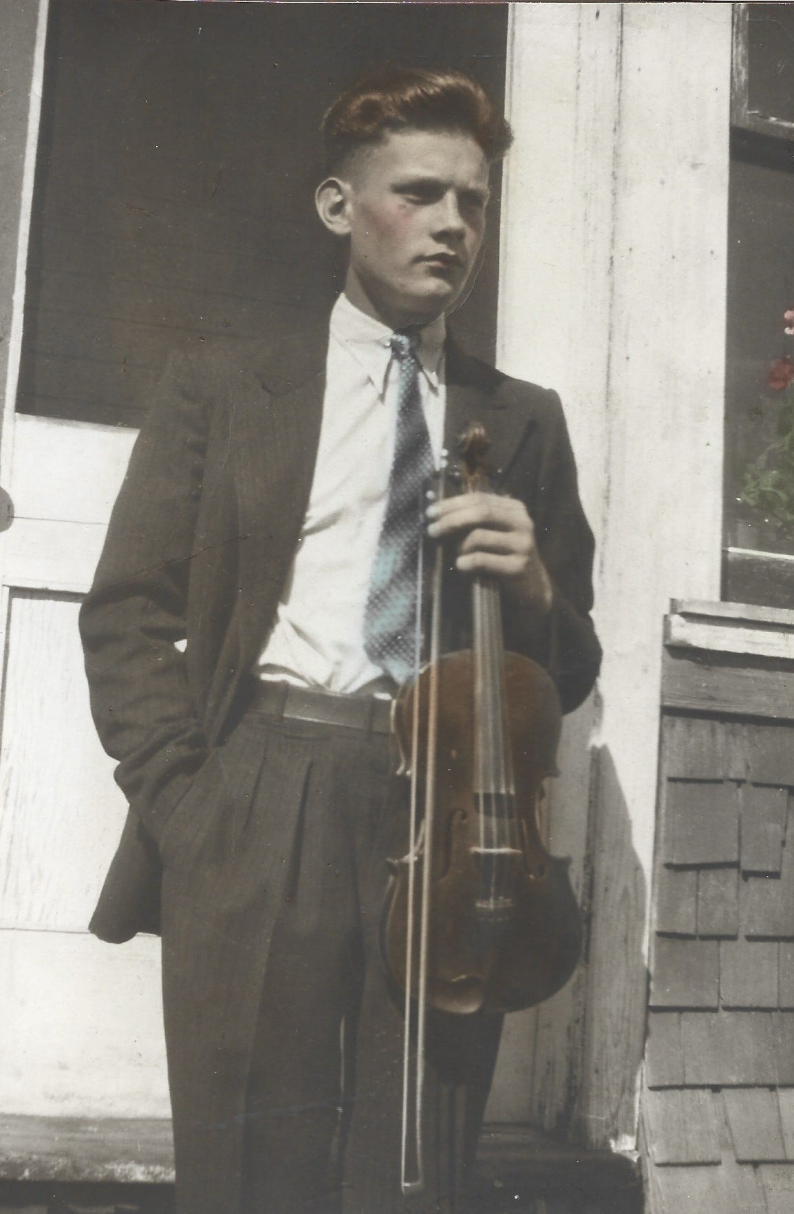 Dressed carefully in a two piece suit and tie. One hand relaxed in his trouser pocket, the other cradles his violin gently at the neck.