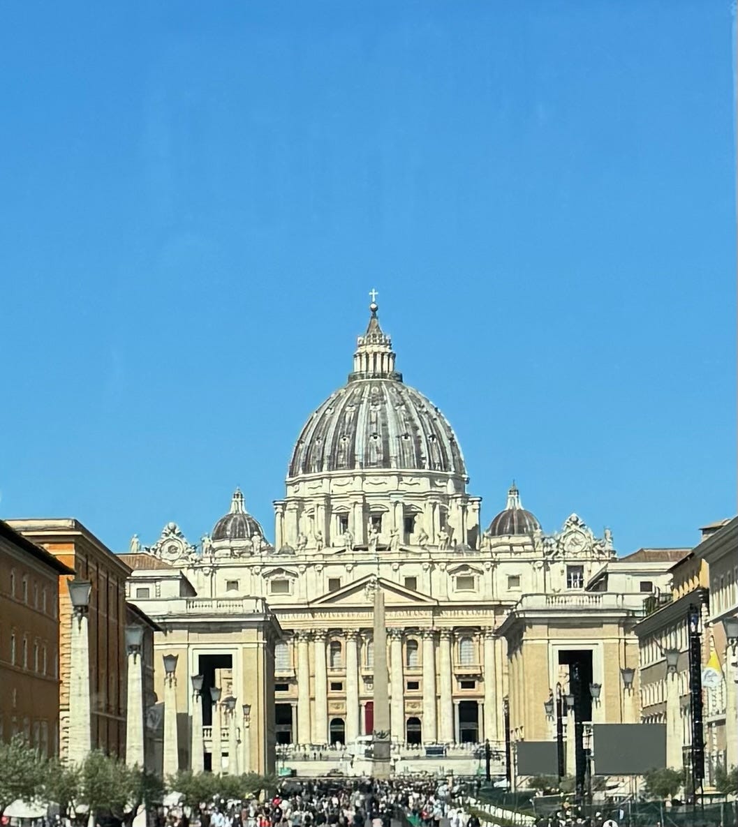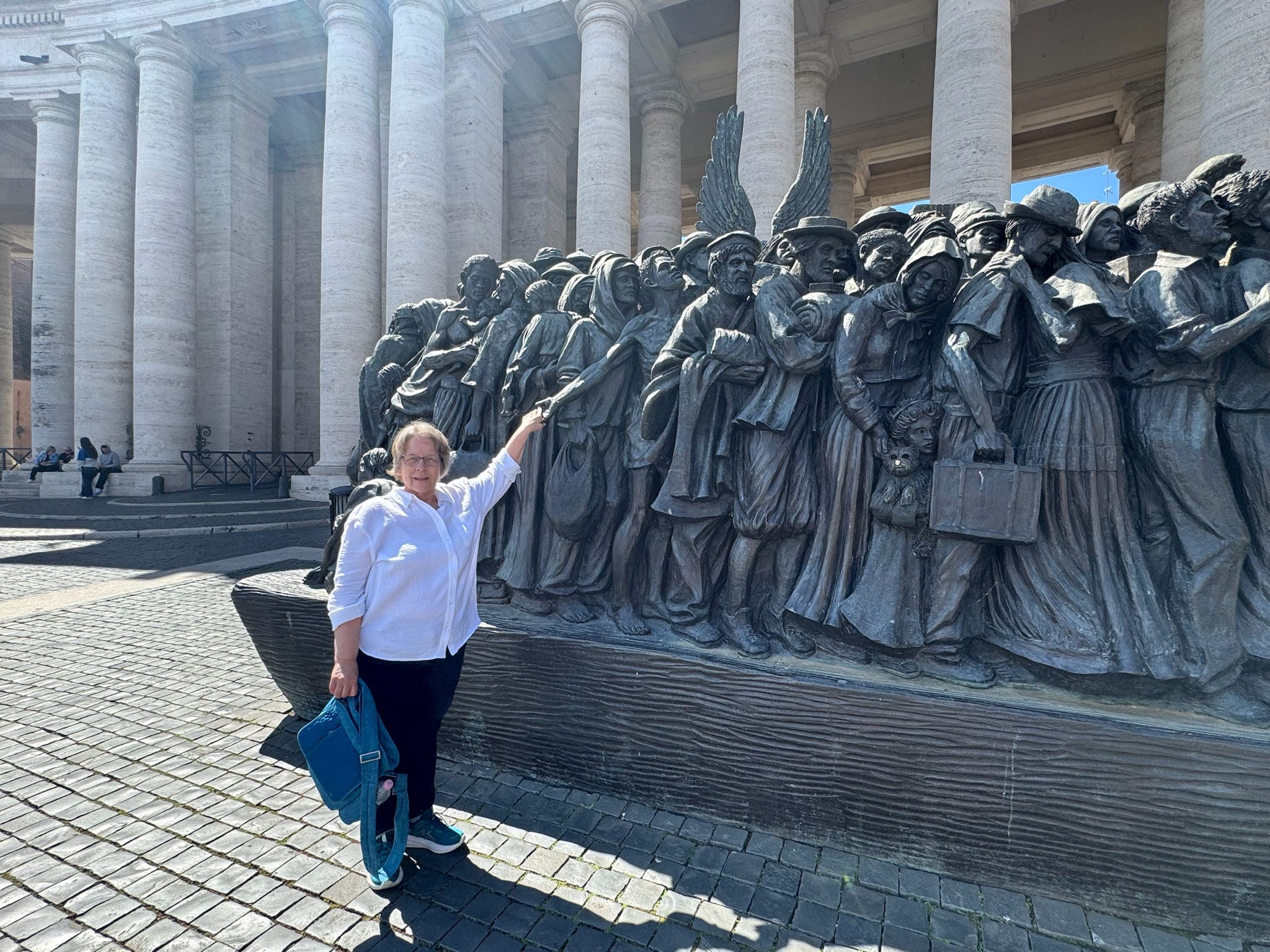 As we walked through the Square, it was impossible to miss Angels Unawares, the first sculpture to be installed in St. Peter’s Square in centuries. This 20-foot bronze work, inspired by the Bible verse Hebrews 13:2—"Be welcoming to strangers, for many have entertained angels unawares"—depicts a crowded boat of migrants from different time periods and regions. At its center, rising subtly above the figures, are angel wings—reminding us of the sacredness of every soul in search of safety and belonging. It was both beautiful and deeply moving.