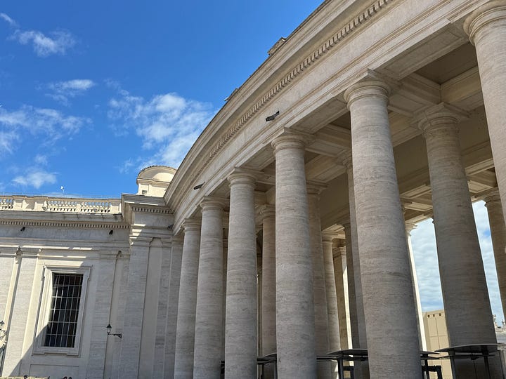 A visit to Rome wouldn’t be complete without a stop at St. Peter’s Square—the grand plaza that opens before St. Peter’s Basilica in Vatican City. Our guided tour was limited to the Square itself, which was just fine with me. While some of our tour companions had arranged their own visits inside the Basilica, we opted instead to simply take in the energy of the space and the significance that radiates from its history.