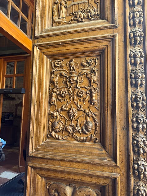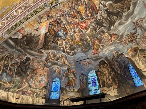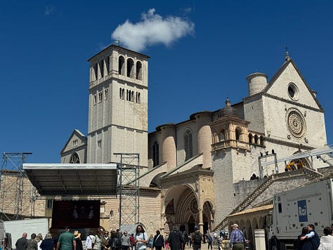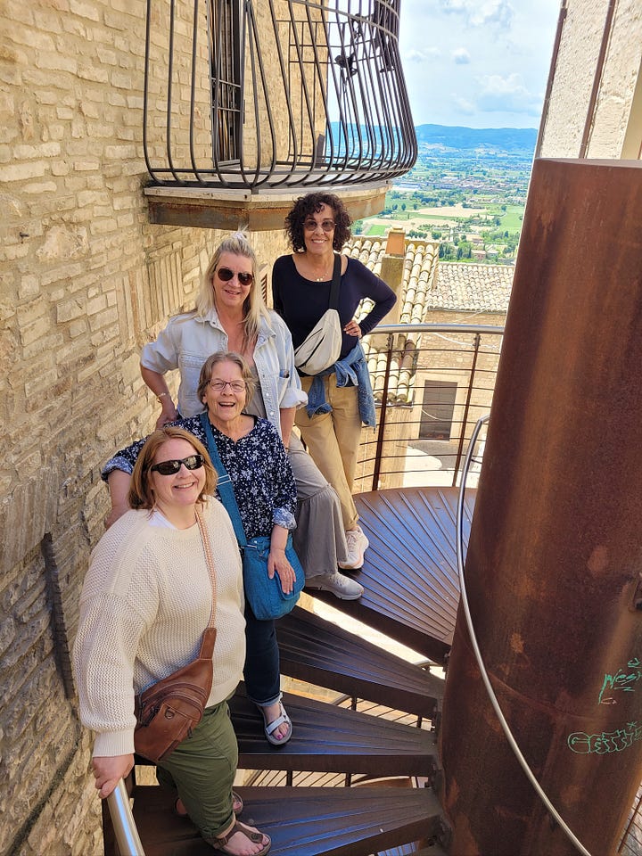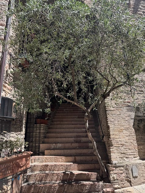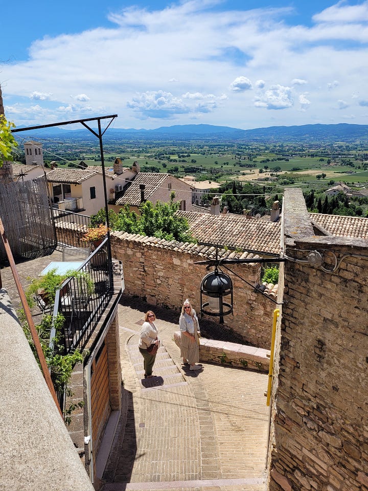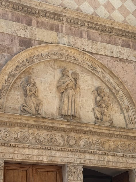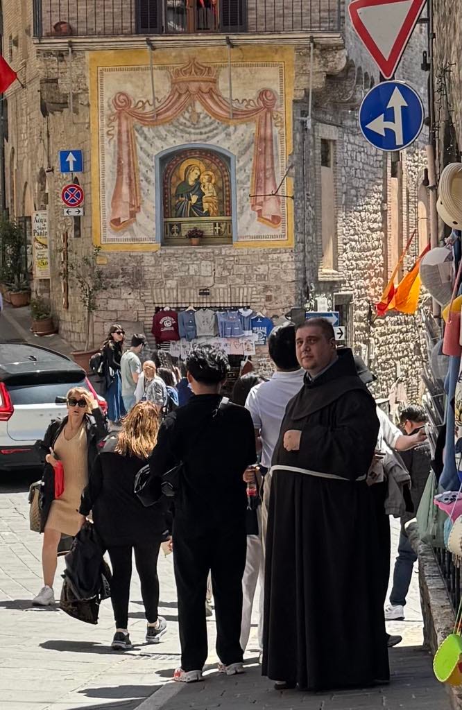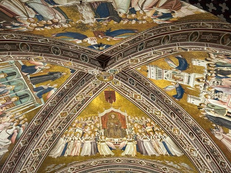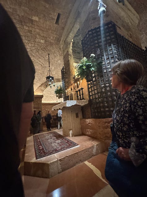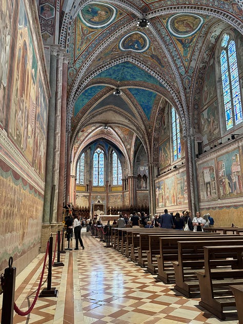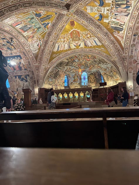 While I was intrigued by the story of St. Francis and the basilica’s designation as a UNESCO World Heritage Site, what stood out most to me was the respect—and the rules. Our local specialist had to follow strict guidelines while guiding us through, and staff were stationed throughout the space to gently remind visitors that photography was not allowed. As you’ll see, we did manage to sneak a few forbidden highlights. Meanwhile, pilgrims sat quietly in the pews, praying, as a calm but persistent voice came over the intercom about every ten minutes or so, or when needed, to remind everyone to be quiet by saying: “Shhhhhh.”