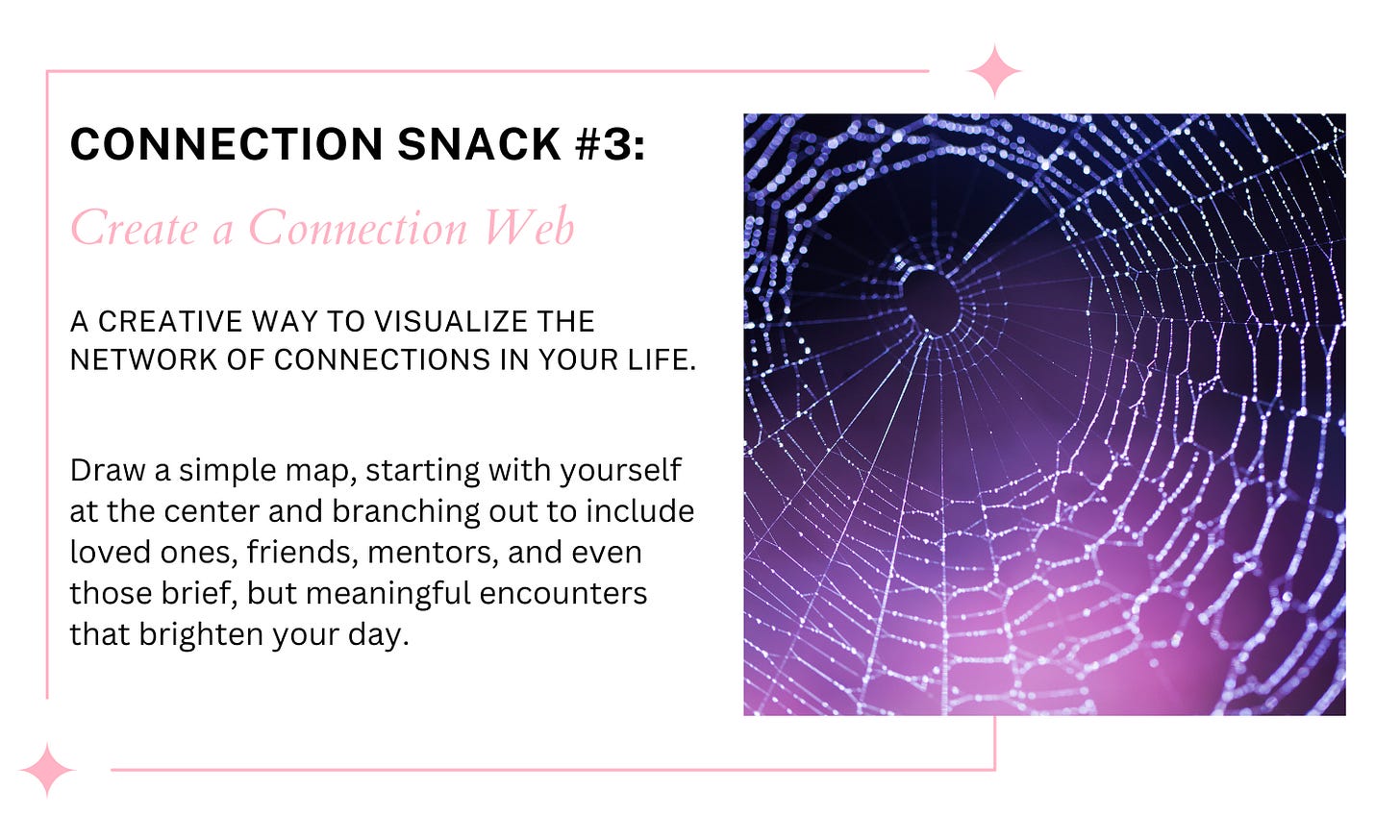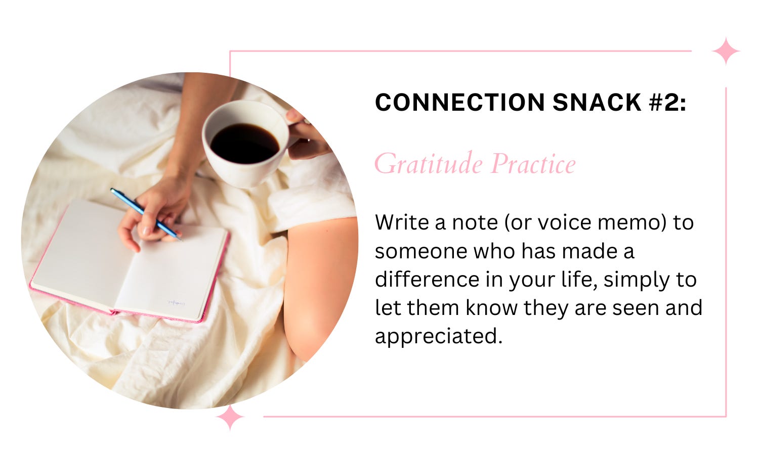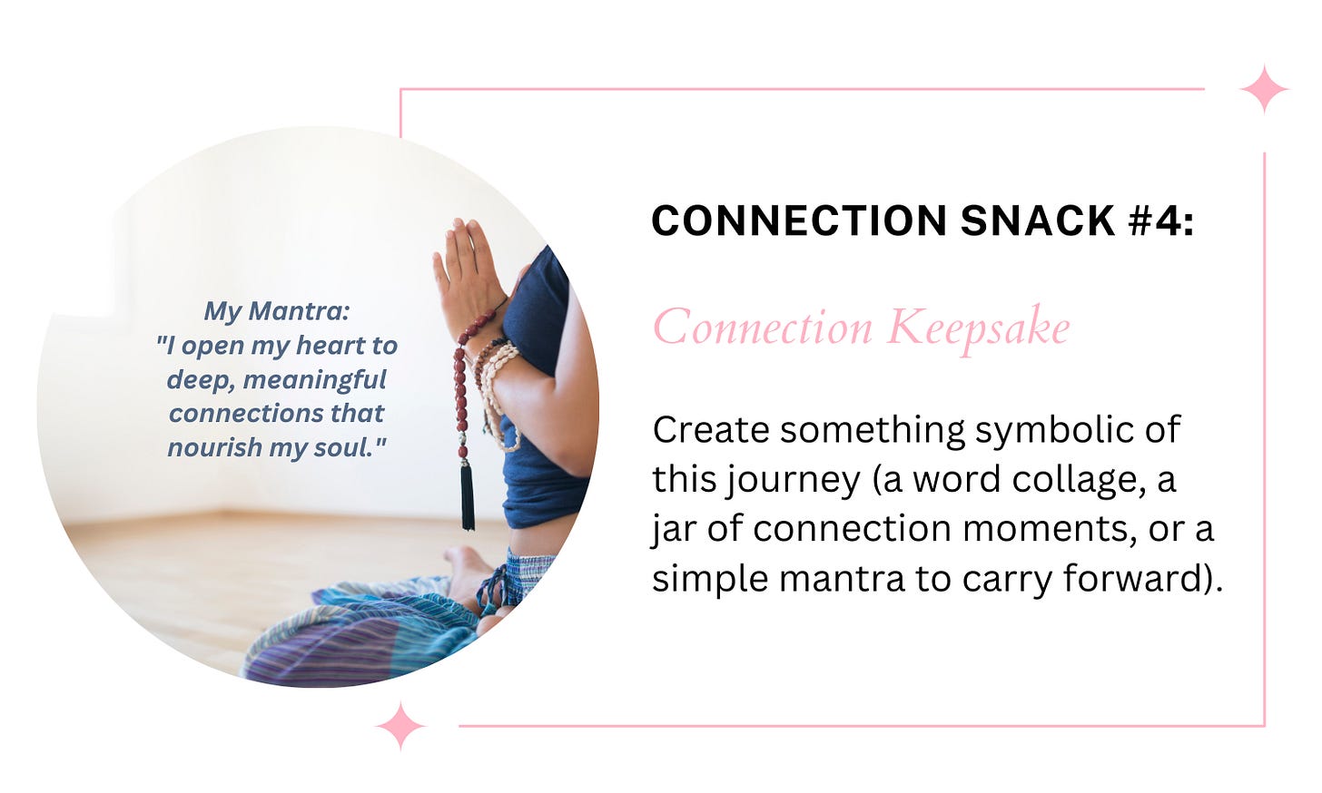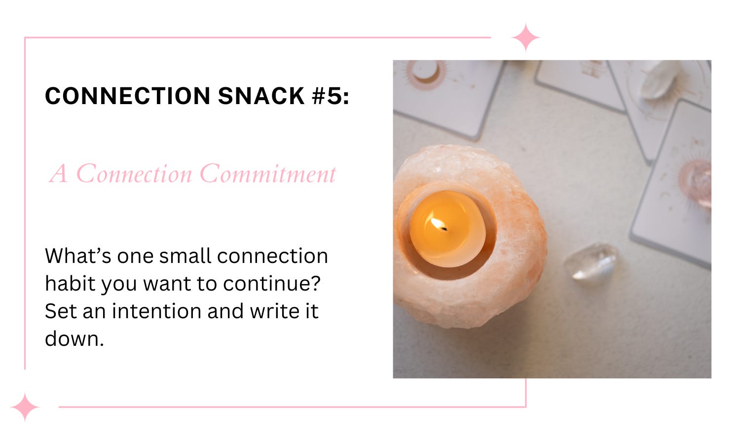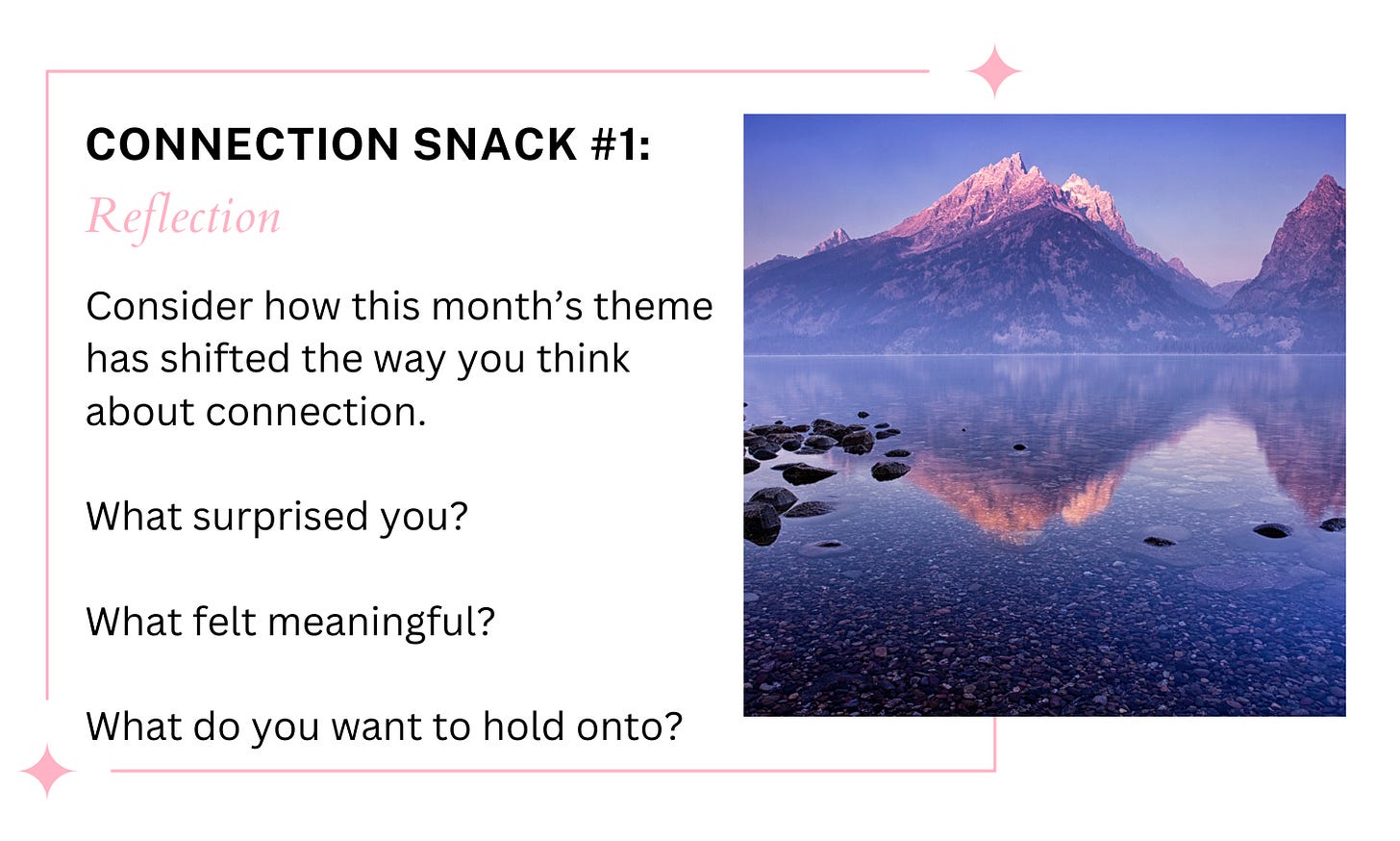 This week, we turn our focus to the lasting impact of connection and how we can carry it forward. I’ve prepared five connection snacks for you. Bite off what you can chew, leave the rest tucked in a drawer for a day you feel a snack might help.